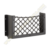 Elegante y al mismo tiempo funcional red de almacenamiento que consiste en un robusto marco de aluminio pintado y una red elástica.