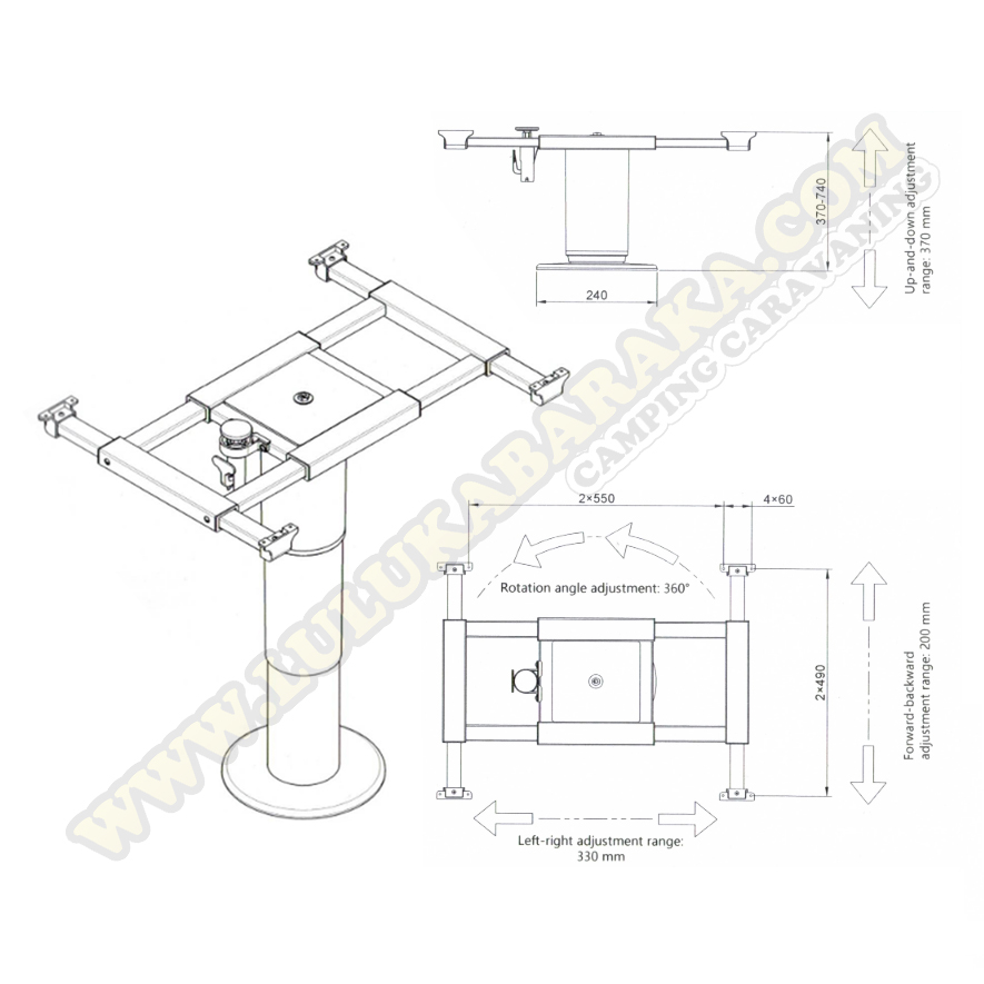 Altura mínima 370 mm, altura máxima 740 mm